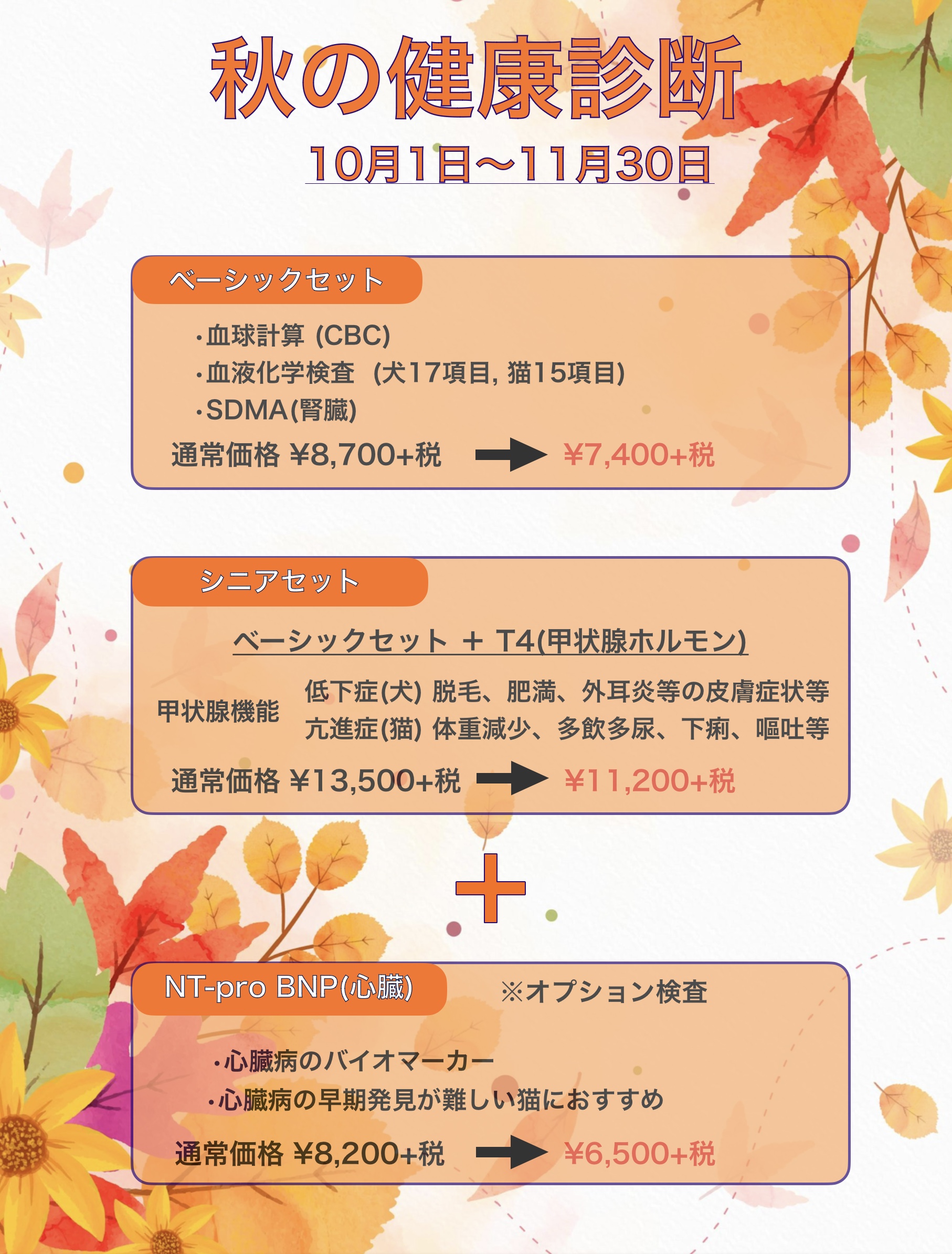 トップ > お知らせ > 秋の健康診断キャンペーン 秋の健康診断キャンペーン 今年も10月1日から11月30日まで健康診断(血液検査)キャンペーンを実施します。 7歳までは年に1回、7歳を過ぎたら年に2回の血液検査をお勧めします。 定期的な検査で病気の早期発見や健康管理をしましょう。 ※健康診断をご希望の際は8時間以上の絶食でご来院下さい。 ※予約は不要です。 ※当キャンペーンの血液検査は結果が出るまでに3~5日程かかります。 共有: クリックして X で共有 (新しいウィンドウで開きます) X Facebook で共有するにはクリックしてください (新しいウィンドウで開きます) Facebook 前の記事へ